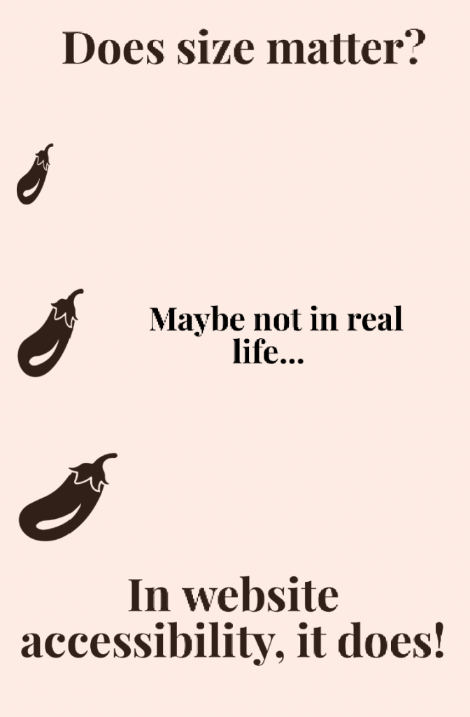 This graphic is both comedic and gives a valuable message. A graphic needs text suitable for a viewer’s eye to see clearly. In this graphic, the comparison is made between the size of an eggplant (with a particular reference) to understand the concept of sizing in accessibility.